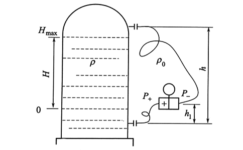 現以上圖為例介紹計算方法。圖中各參數的數據為:ρ為被測液體的密度(ρ=0.9g/cm3);ρ0為午夜精品福利一区二区三区蜜桃毛細管所充工作介質密度(ρ0=1.0g/cm3);H為被測液位的變化範圍(H=2800mm);h為被測液位高低取樣管中心距(h=3800mm);h1為午夜精品福利一区二区三区蜜桃測量室中心與低取樣管的距離(h1=1200mm);P0為容器內工作壓力。